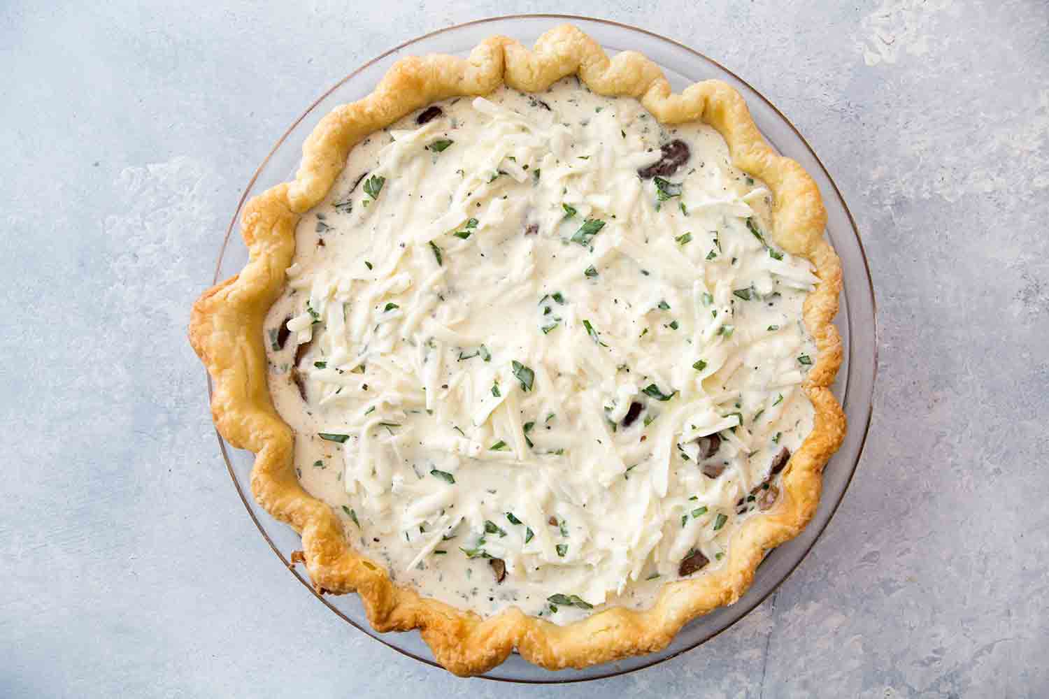 Spread the sautéed mushrooms along the bottom of the pre-baked pie crust. Pour the cheese and cream mixture over the top of the mushrooms.