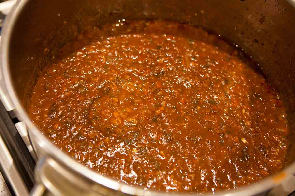 The onions cook for a long time, during which you can prep the rest of the vegetables if you want to save some time. If you are using dry herbs, use half as much. The mincing is important, as the sauce is not strained or puréed.