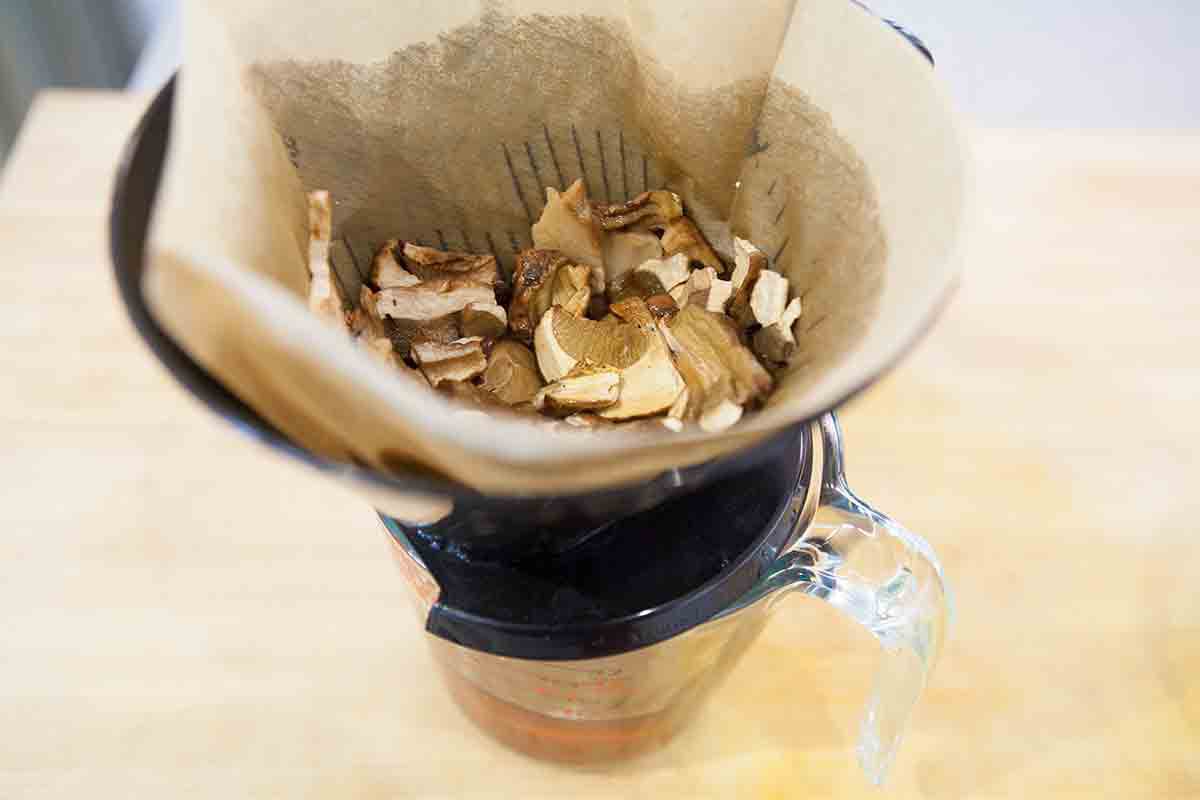 The easiest way to do this we found is to pour the porcini and soaking liquid through a coffee filter, into a bowl or measuring cup. This helps remove any grit that may be lingering in the soaking liquid.