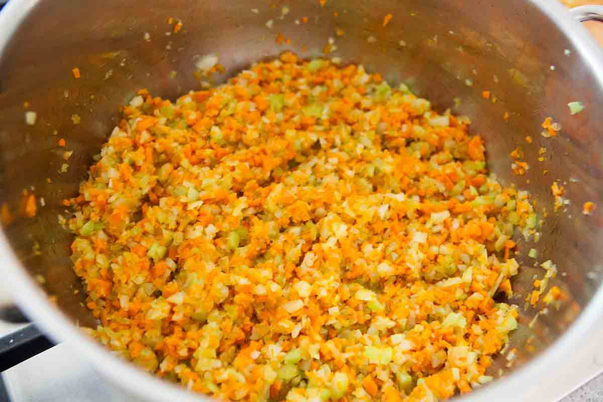 Add the minced carrots and cook for 5 to 6 more minutes. Add the celery and cook until soft, about 10 more minutes. Add the garlic, parsley, rosemary, thyme, and marjoram. Cook for 4 to 5 minutes more.