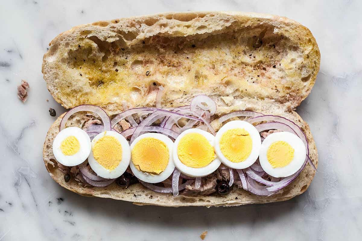 Canned tuna, anchovies, olives, tomatoes, onions and hard-boiled eggs are a few of the standard ingredients, but this sandwich can be a catchall for any others you might have around.