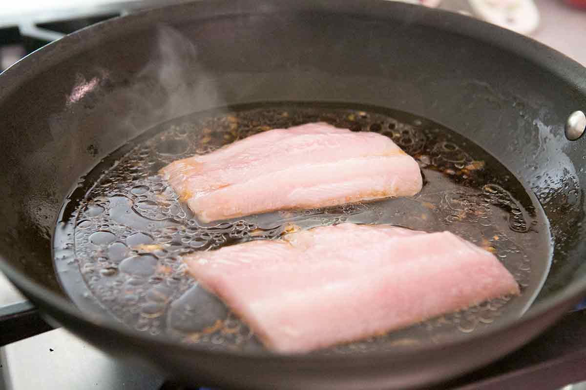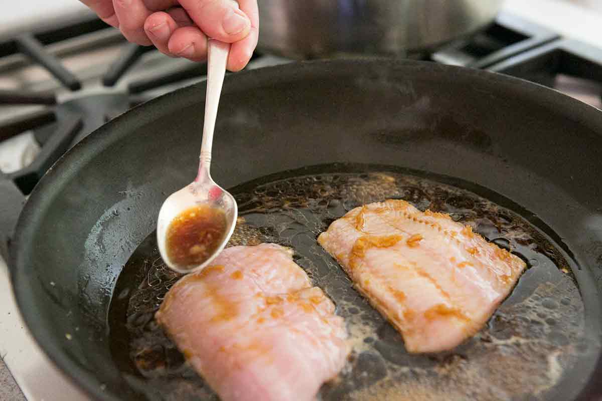 Lay each fillet in the pan. (If using skin-on fillets, place the fillets skin-side down in the pan.) Use a spoon to baste the tops of each fillet until you see the flakes of the fish separate a little, which should take about 30 seconds to 1 minute per fillet.