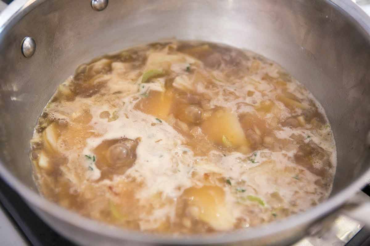 Bring to a simmer, lower the heat, partially cover, and simmer until the potatoes are tender and easily fall apart, about 15 to 20 minutes.