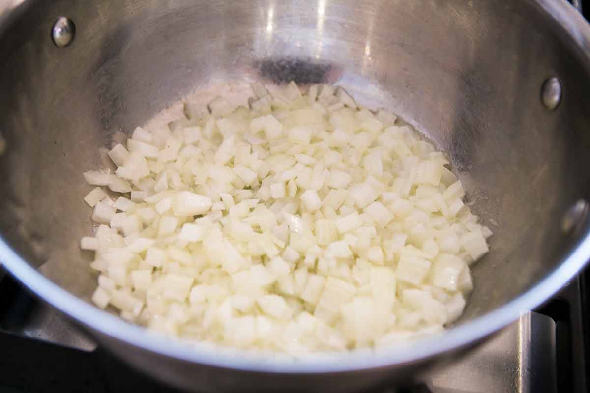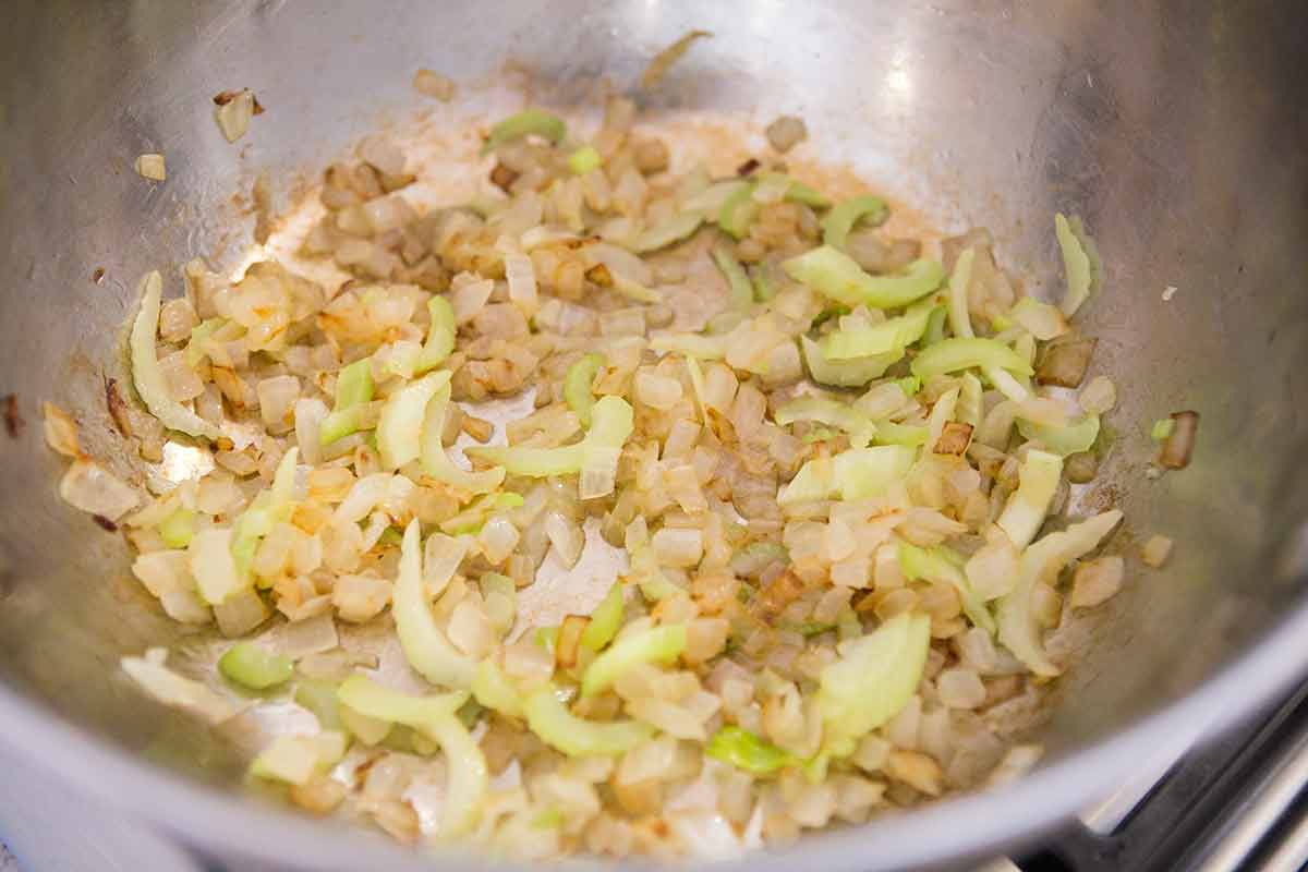 Melt butter on medium heat in a large, thick-bottomed pot. Add the onions and cook until golden, about 10 minutes. Add the celery and cook 5 minutes more.