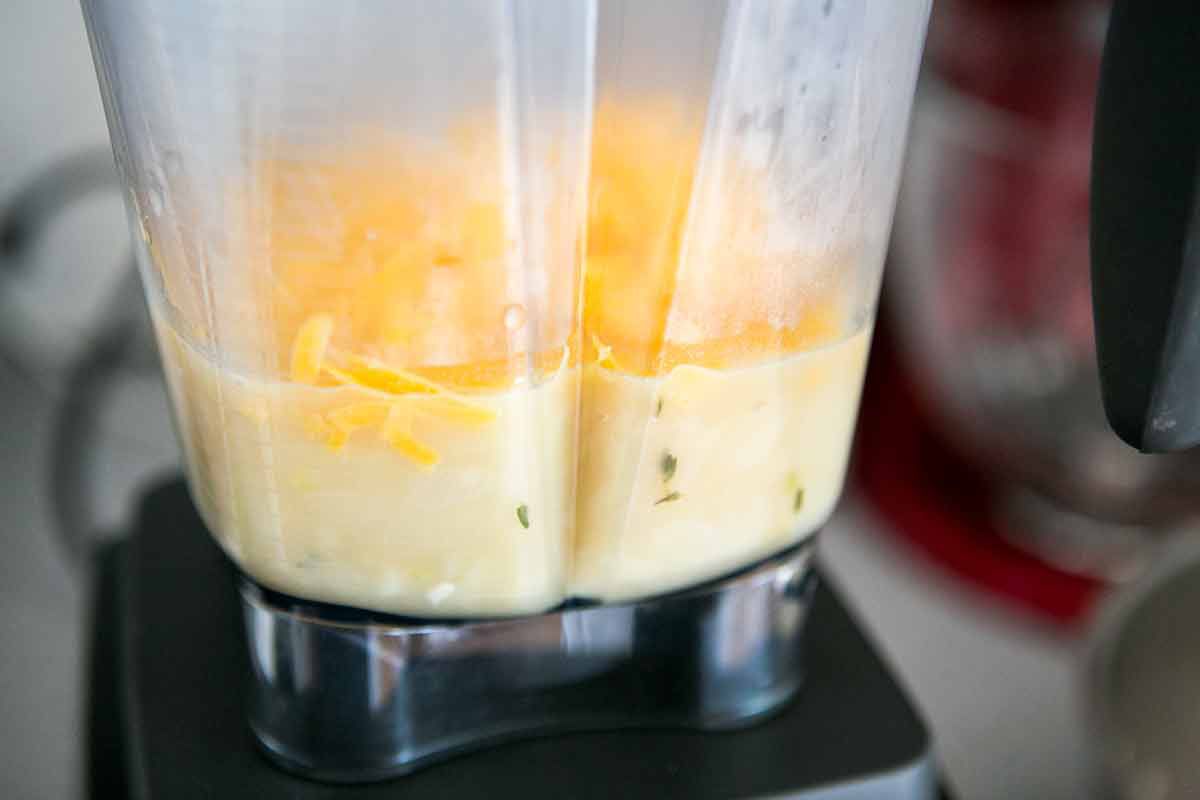 Add a portion of the grated cheddar to the blender bowl as well. (If it takes 3 batches to purée the soup, divide the cheese into 3 portions.)