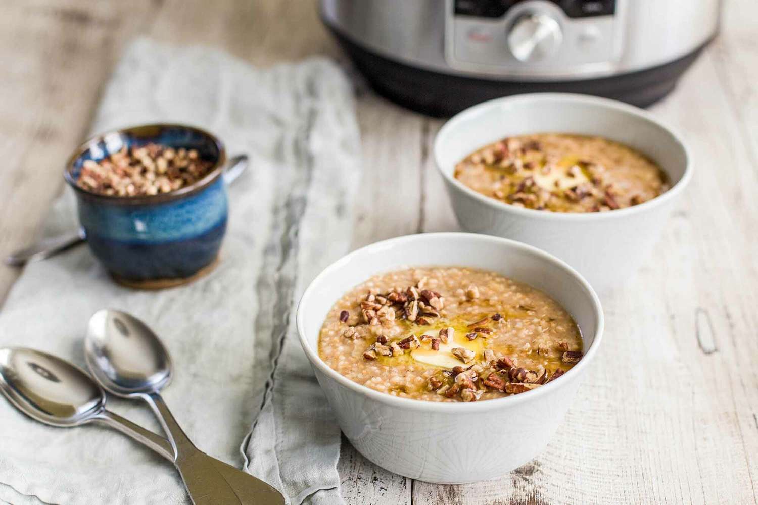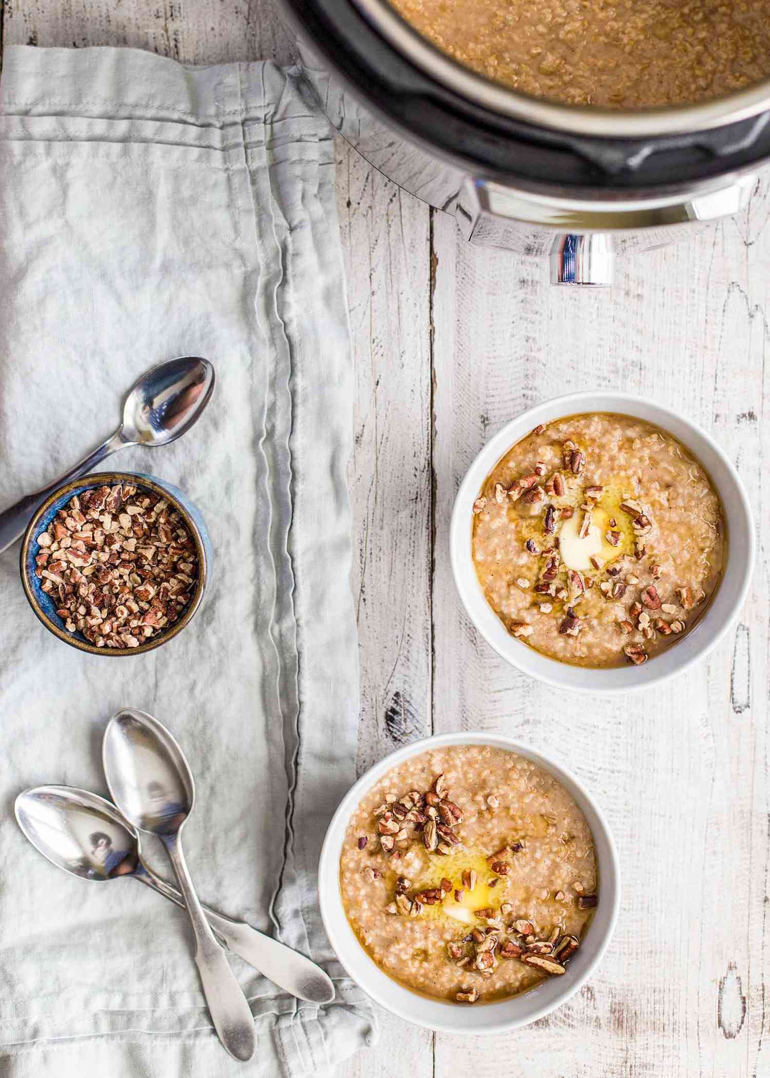 Whenever I make steel cut oats, I take the extra step of toasting the oats in a little bit of butter or coconut oil using the pressure cooker’s sauté setting. This adds a bit of toasty flavor and makes the house smell amazing, too.