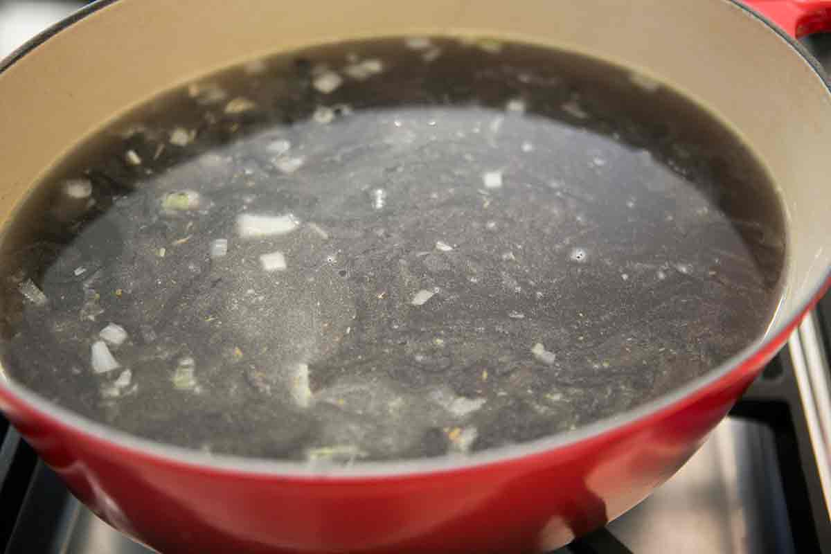 Add the drained beans and 2 quarts of water to the onions. Bring to a simmer. Partially cover the pot and lower the heat to maintain a simmer. Simmer for 2 hours.