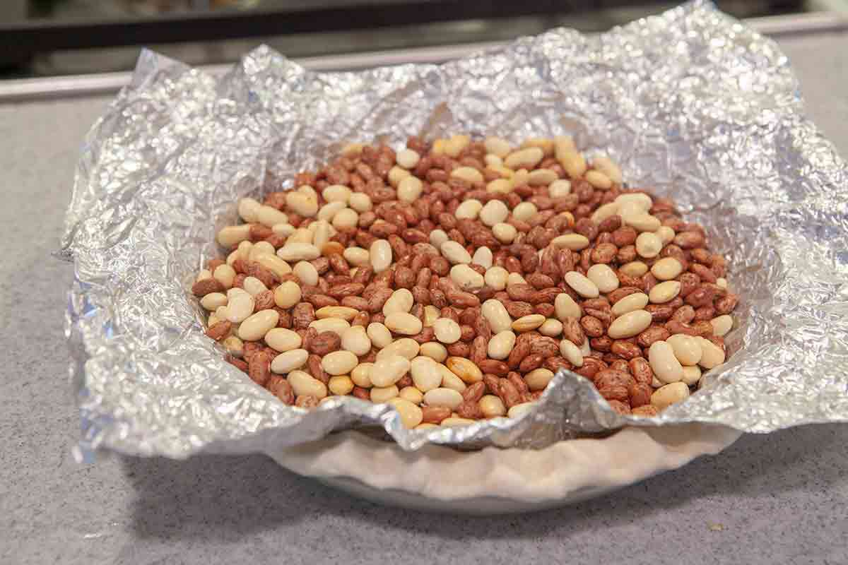 Line the frozen pie shell with aluminum foil. Fill two-thirds of the way with pie weights (dry beans work well for this).