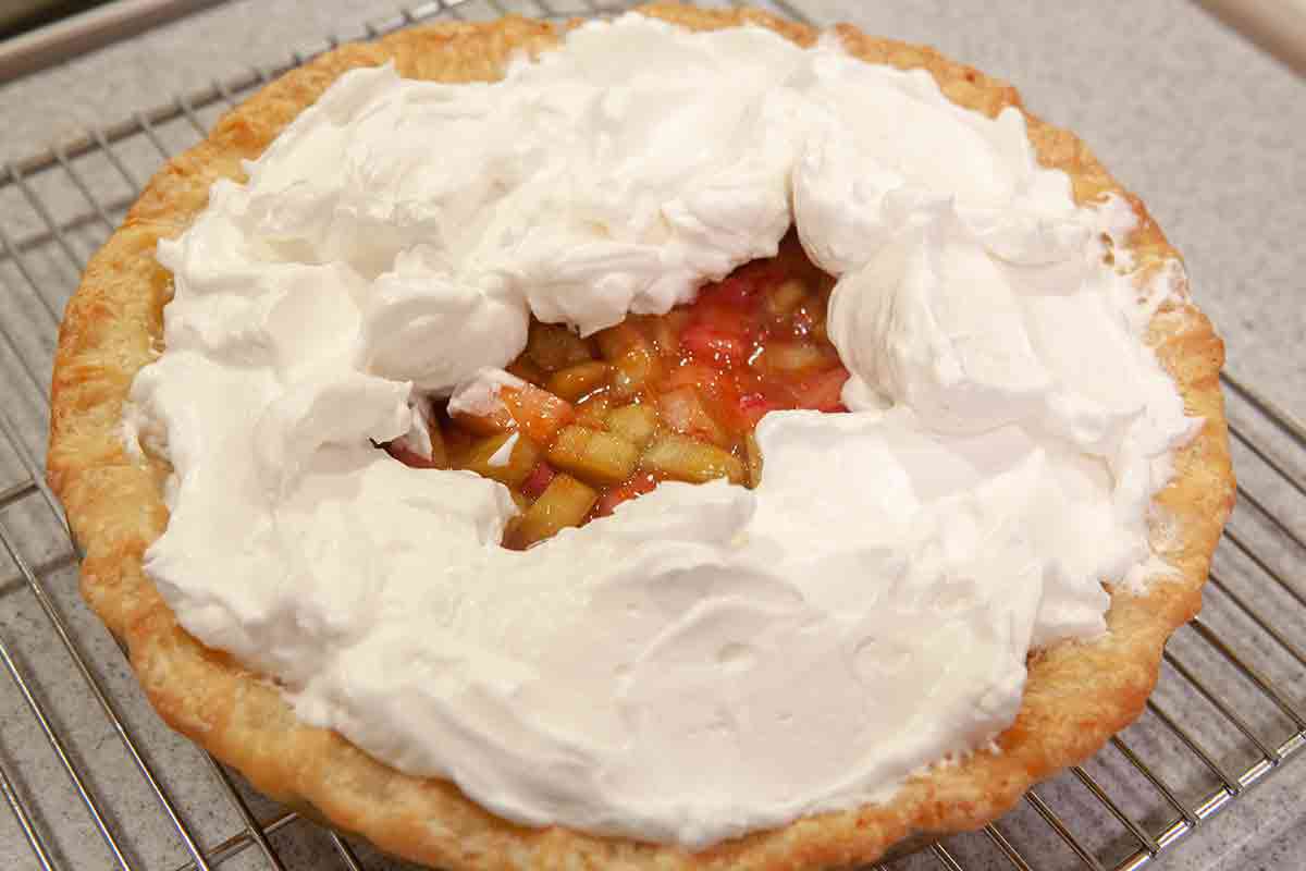 - Add meringue while filling is hot: As soon as you put the hot rhubarb filling into the pie crust, start adding the meringue mixture to the top. The heat from the filling will help the meringue set.