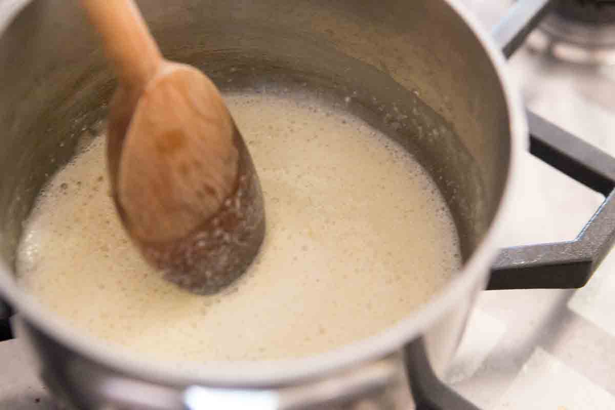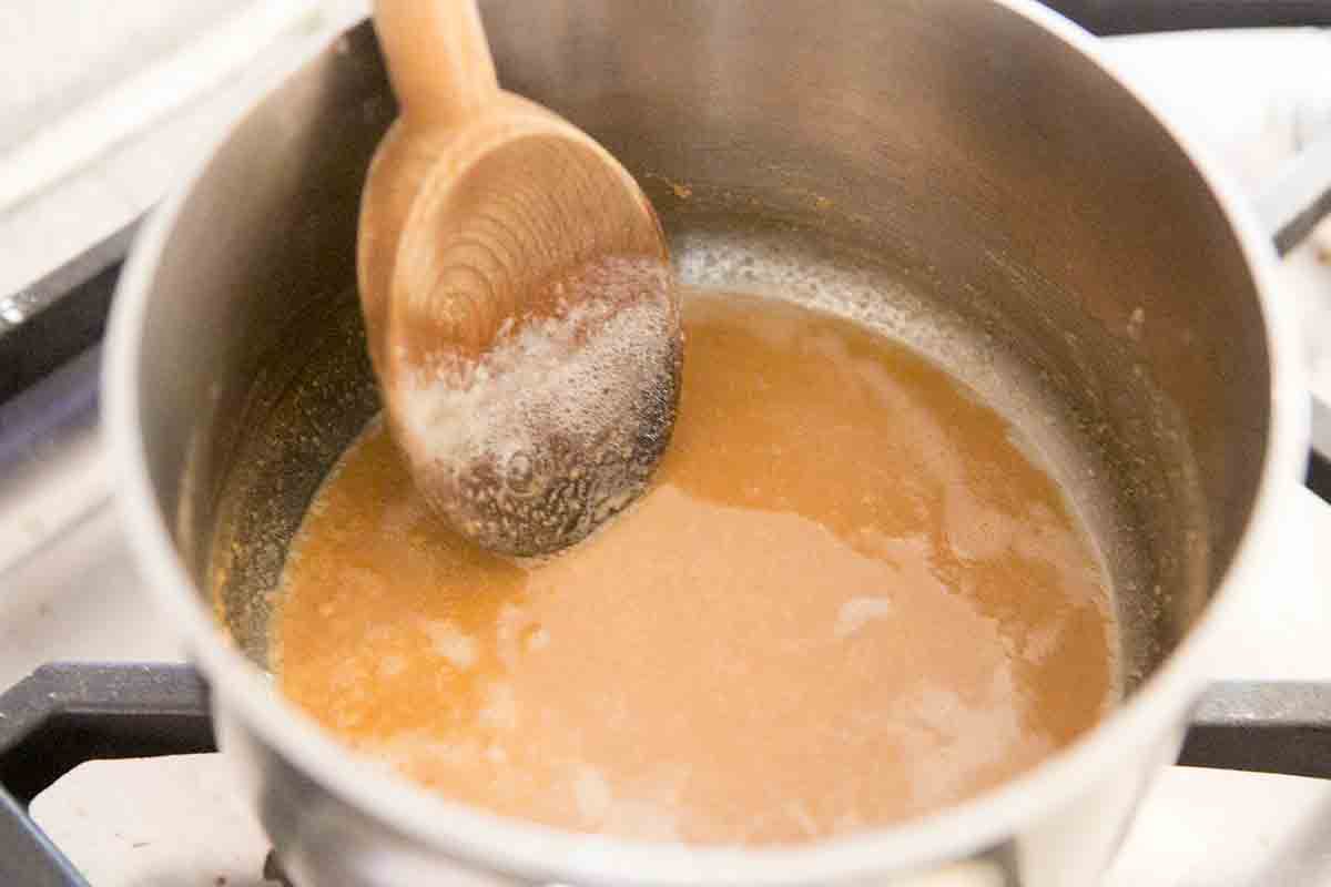 Melt the 2 tablespoons of butter in a small pot and stir in the flour. Cook the butter flour mixture over medium-low heat, stirring often, until the mixture is the color of coffee-with-cream.