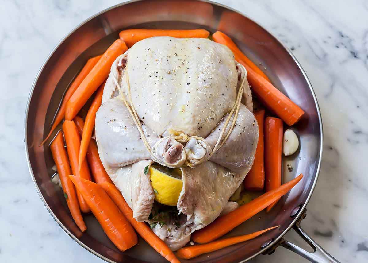 This roast chicken recipe takes little time to prep and then into the oven it goes. Stuff the chicken with lemon, garlic, and thyme. If you want, truss it for a more attractive presentation. Put the chicken in an oven-proof skillet (a cast iron pan works well for this) surrounded by carrots and garlic.