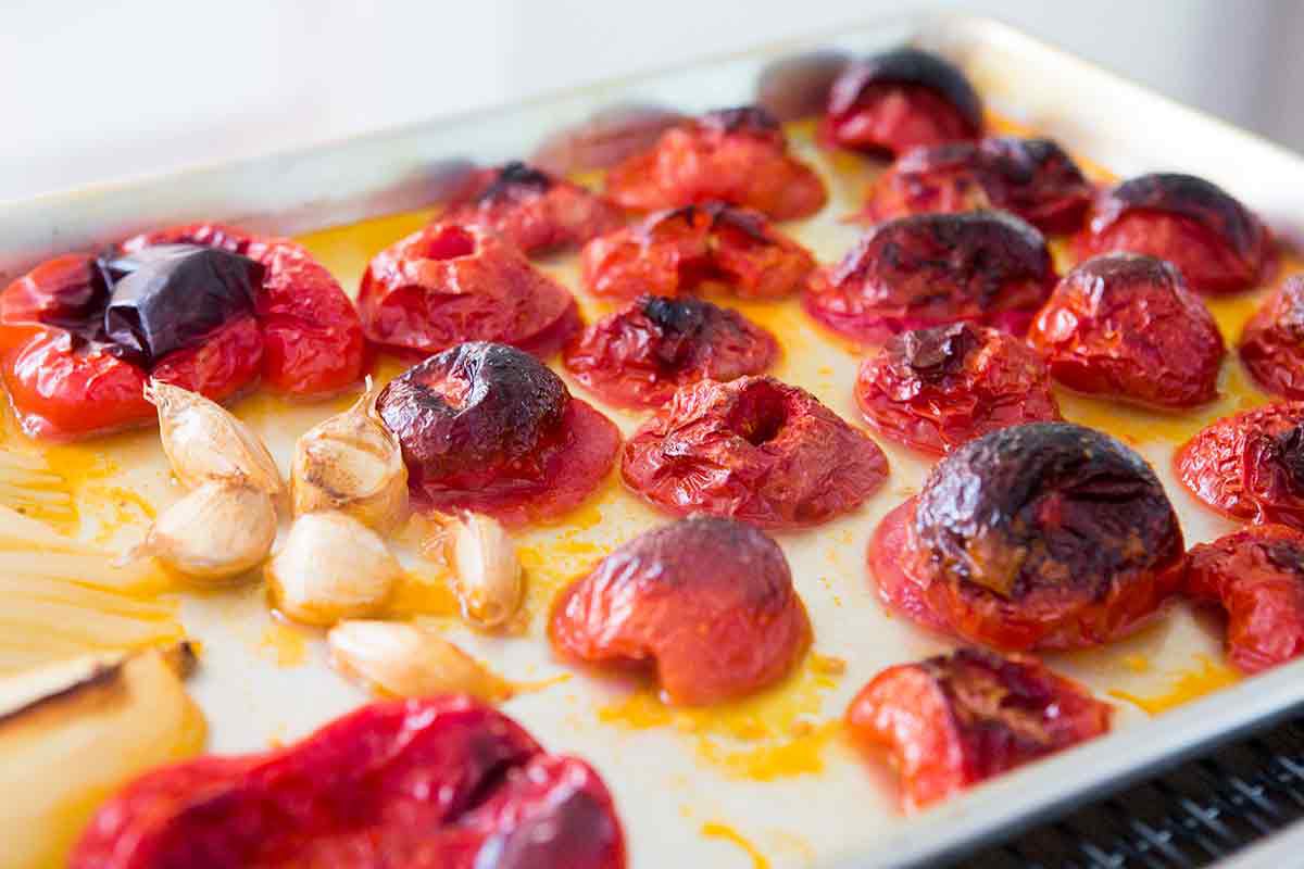 Remove the baking sheet from the oven and allow it to cool for 10 minutes. Pick the tomato and red pepper skins off the tomatoes and peppers and discard. Peel the skins off the garlic and discard. Reserve the baking sheet.