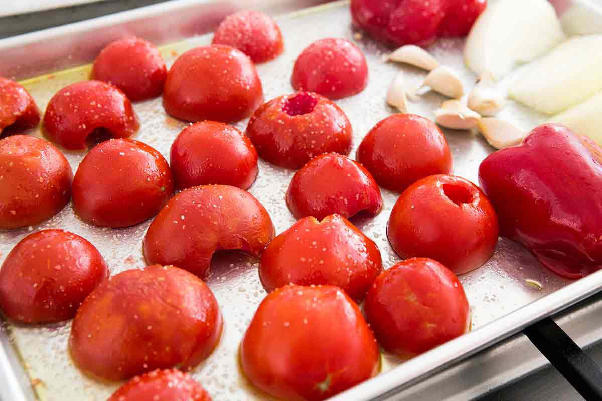 You can roast the tomatoes either cut side down or cut side up. We roast our cut side down because you can then easily lift the skins off of the tomatoes and peppers after they've charred a bit.