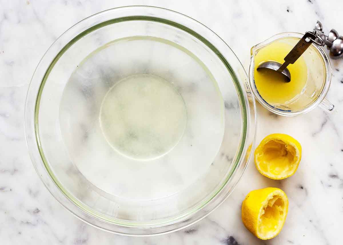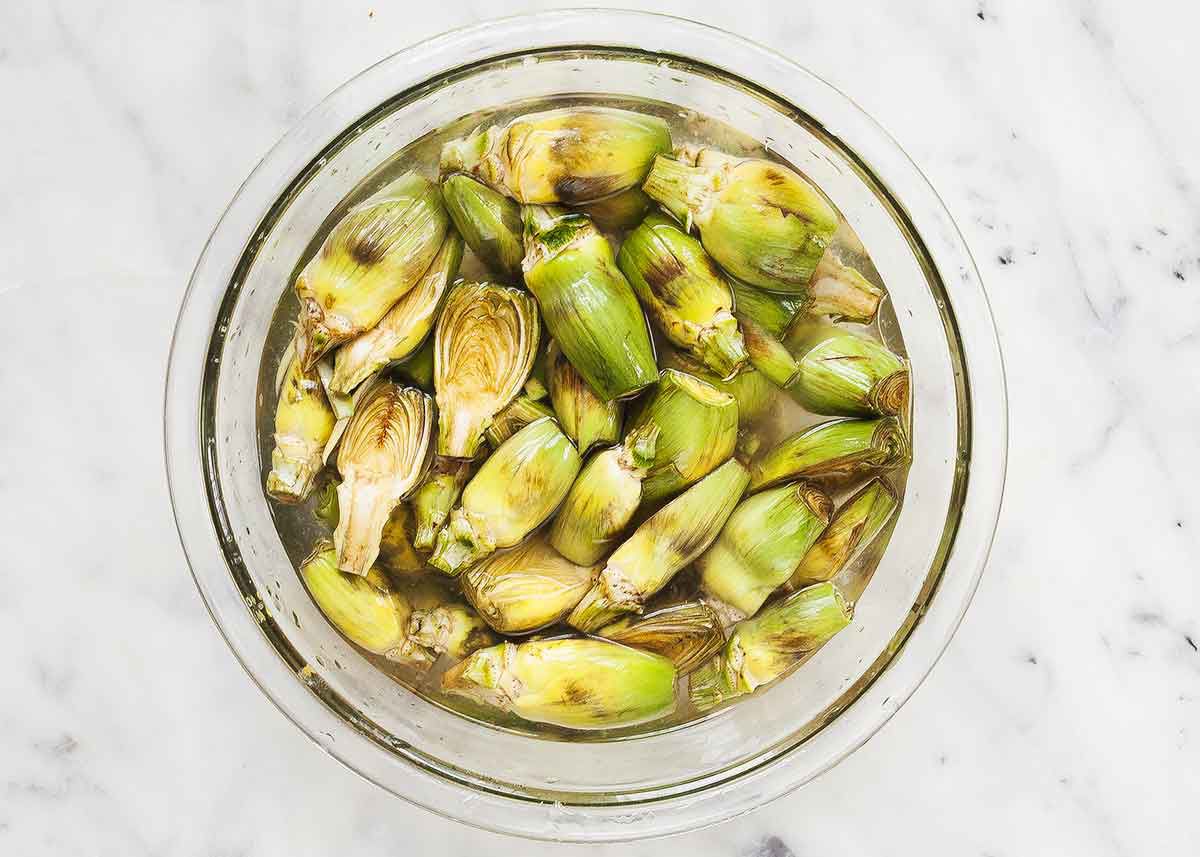 Rinse the baby artichokes. Fill a bowl with 3 cups of water and add 3 tablespoons of the lemon juice to it.