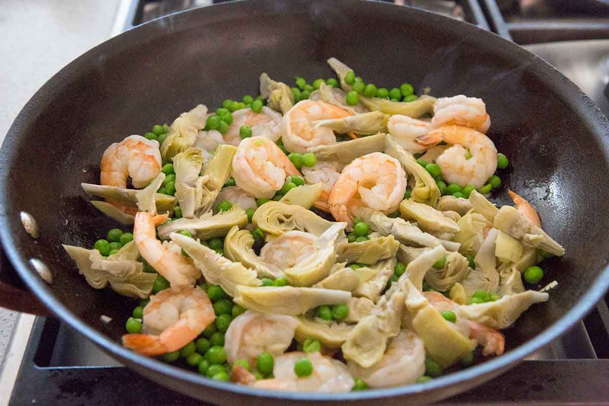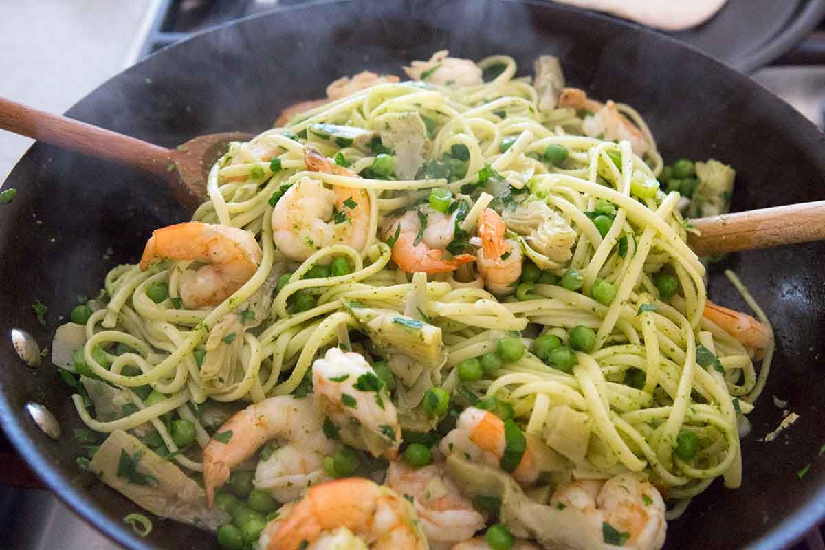 Even though it looks like a lot is going on—shrimp, artichokes, peas, pesto, pasta—the whole dish can be made in the time it takes to cook the pasta!