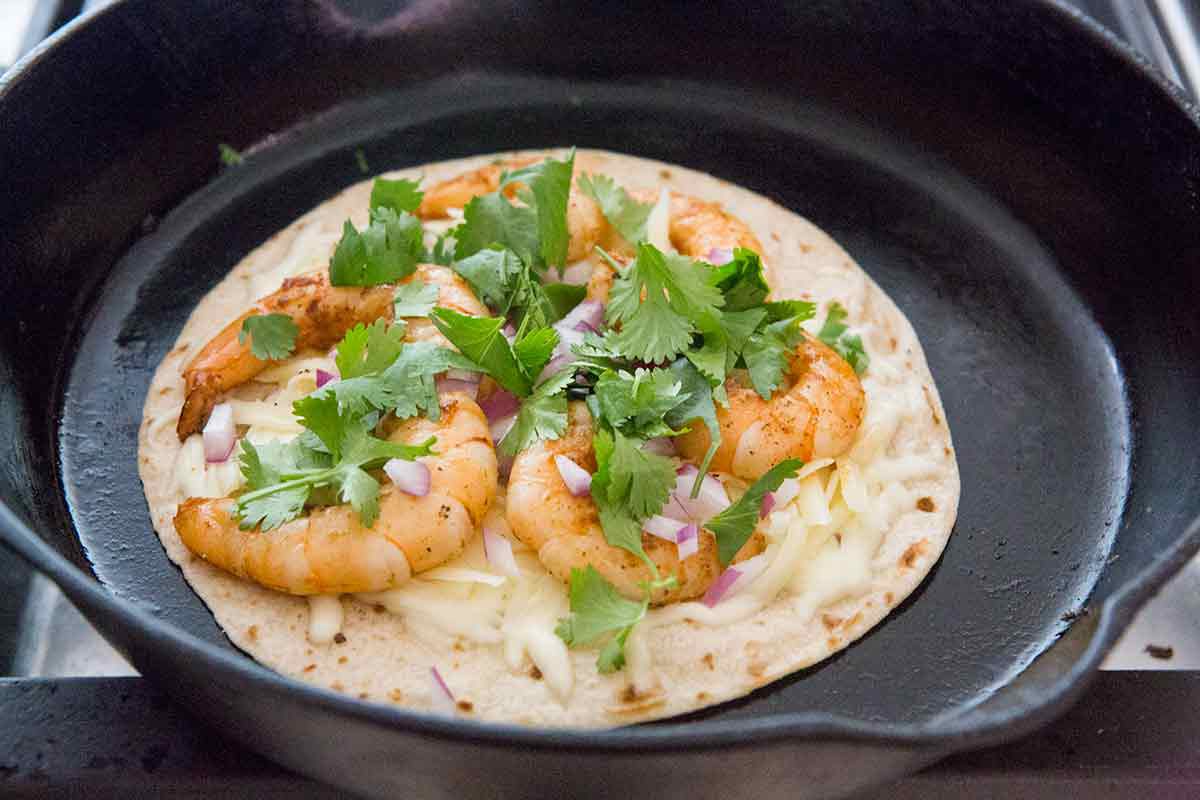 One way to take a quesadilla from snack to a meal is to add some protein, like chicken, beef, or in this case shrimp.