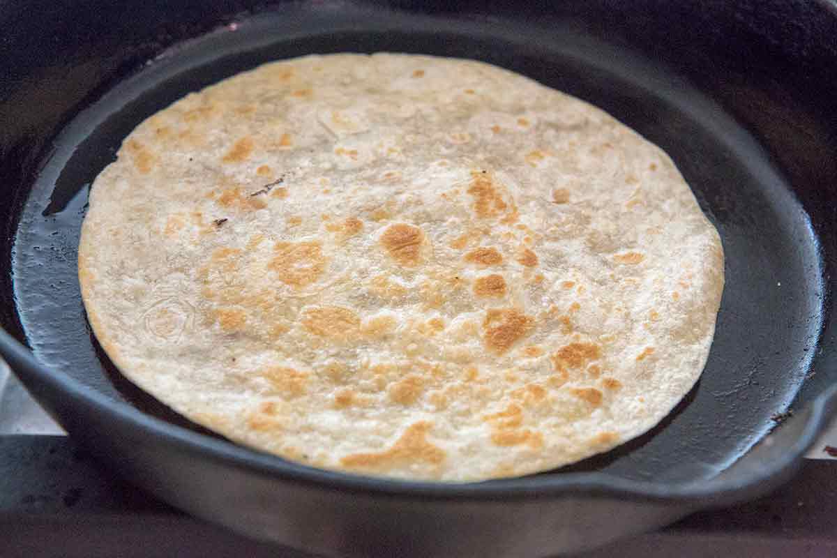 Place one flour tortilla on the skillet. Flip the tortilla over a few times, 10 seconds between flips. Air pockets should begin to form within the tortilla.