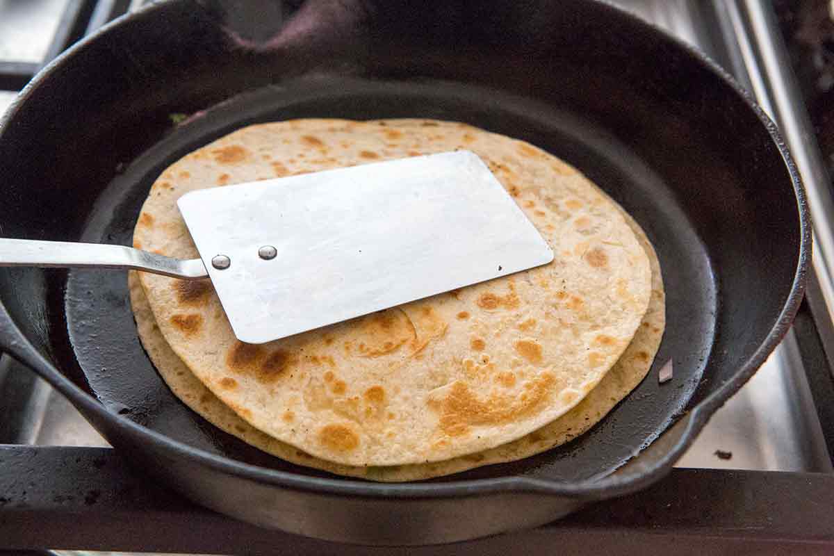 Elise Bauer Remove the tortilla and repeat with the second tortilla. Leave the second tortilla in the pan and reduce the heat to medium.