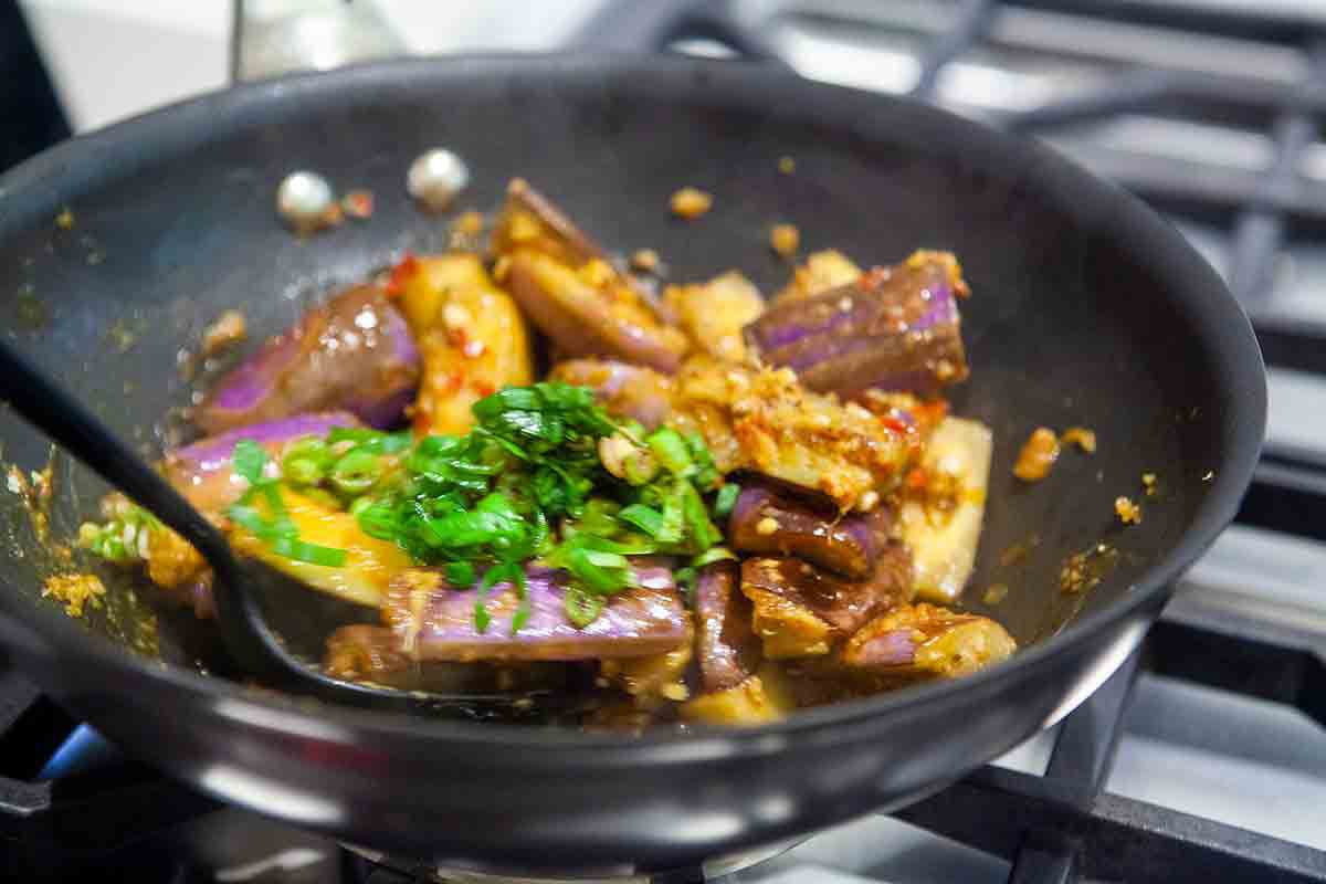 Place the oil in a wok or large sauté pan over medium-high heat until the oil is almost smoking. Add the eggplant and sauté, allowing it to sit for a few seconds each time you move it to allow it to brown and blister. If the eggplant absorbs all the oil and some pieces don't get any then add a little more oil.