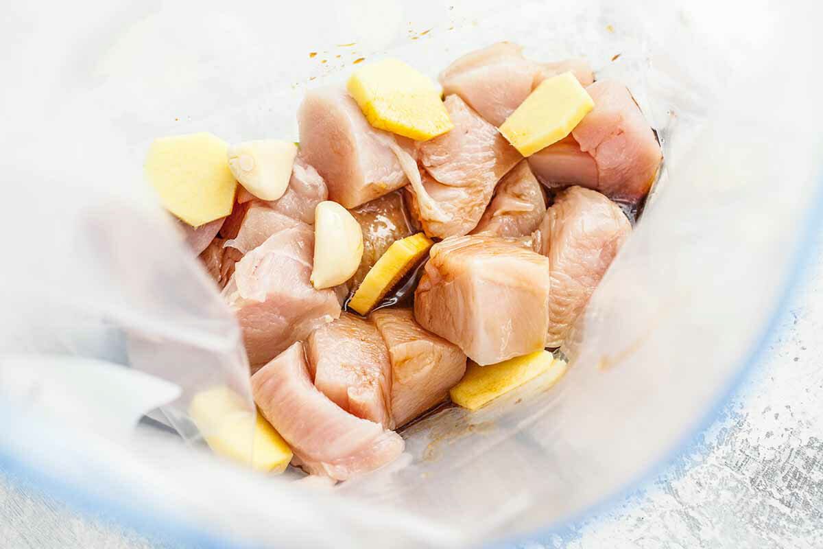 Combine the cubed chicken breast along with ginger, garlic, sesame oil, soy, and rice wine vinegar in a gallon-sized zip-top freezer bag. Make sure the chicken is in a single layer.