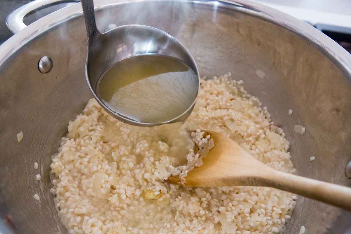 Begin to add the broth, a ladleful (about 1/2 a cup) at a time. After each addition of broth, stir the rice and do not add another ladleful until the liquid in the pot has been almost all absorbed by the rice.