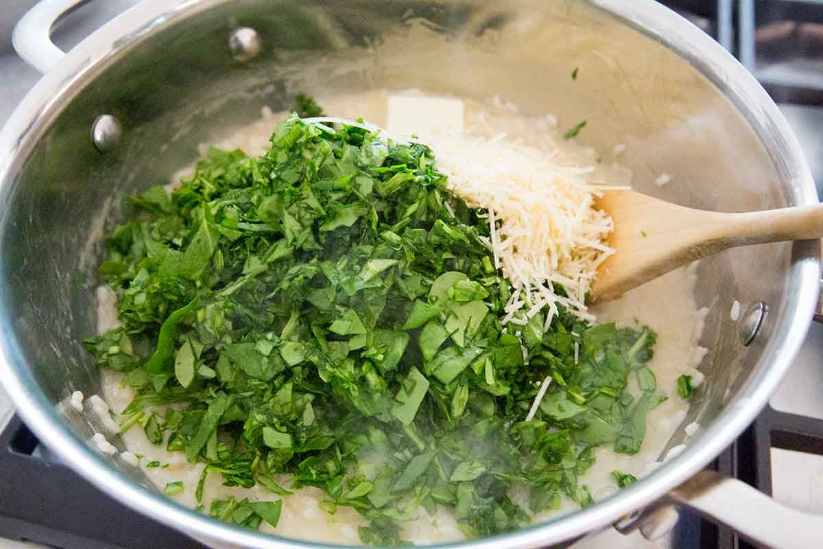 It's a simple risotto—made in the classic Italian way with risotto rice, stock, wine, and Parmesan—with the addition at the end of a half pound of chopped baby spinach with a little lemon zest and juice to brighten the flavors.