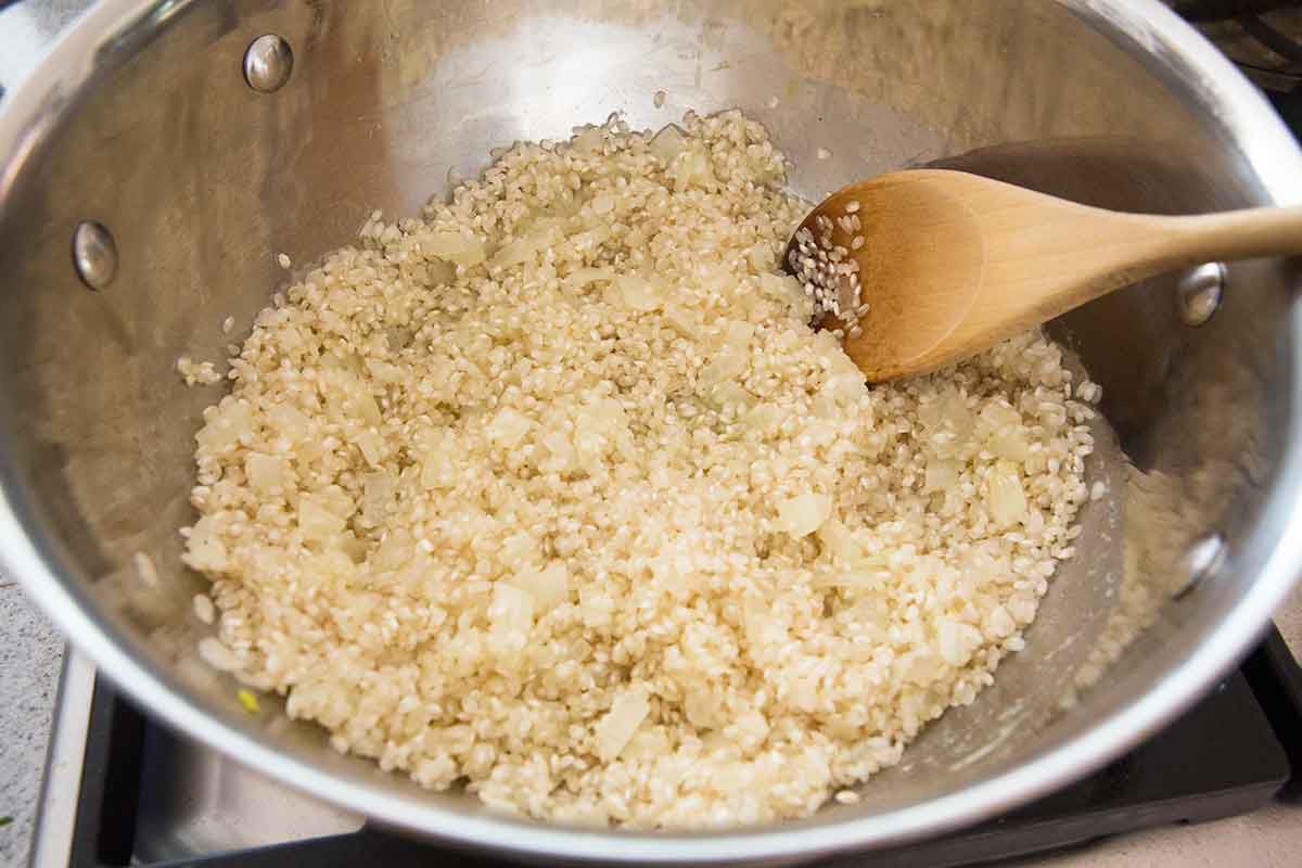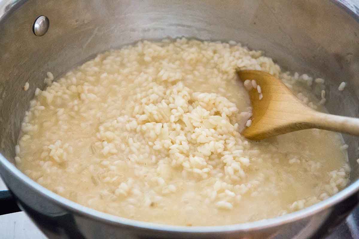 A tip about making risotto—use a rice that is meant for risotto, like arborio or carnaroli—and don't rinse the rice. You want to use a starchy rice because it's the stirring and slow even cooking that helps loosen the starch to create the creaminess of the risotto.