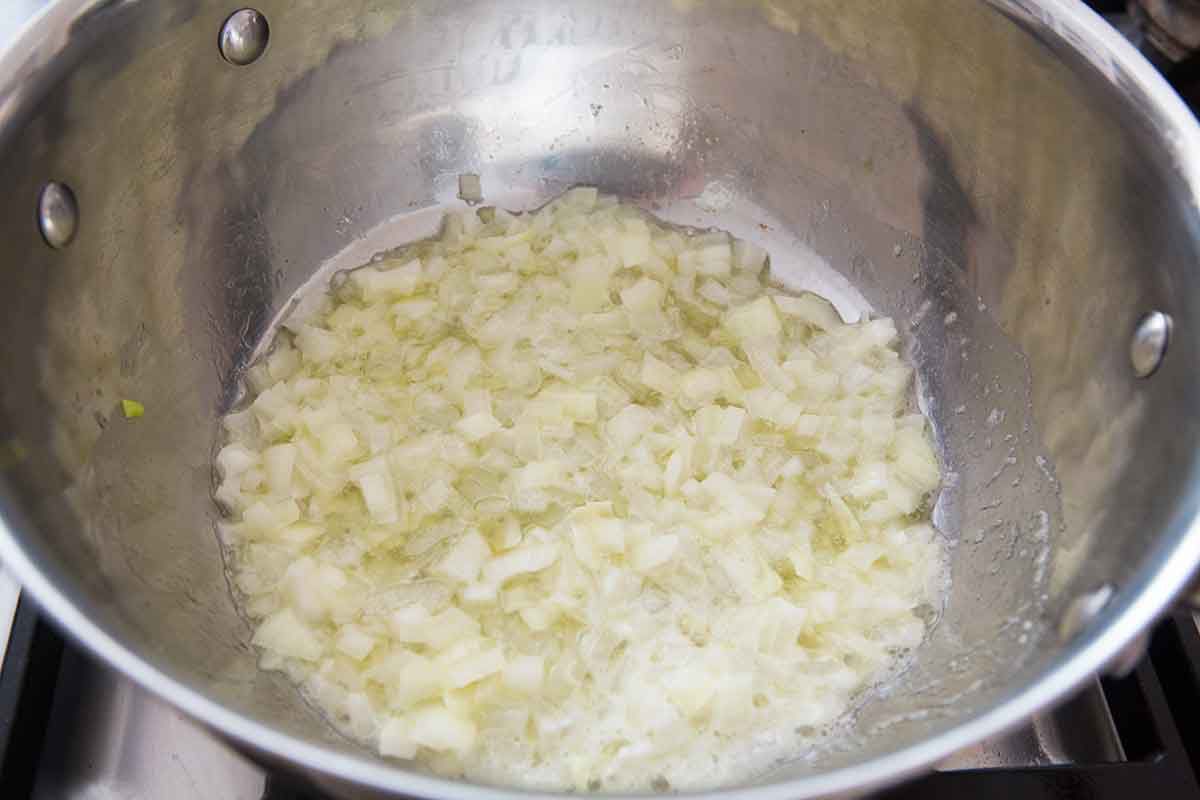 Melt 4 tablespoons of butter in a wide saucepan on medium to medium high heat. Add the onions and cook until translucent.