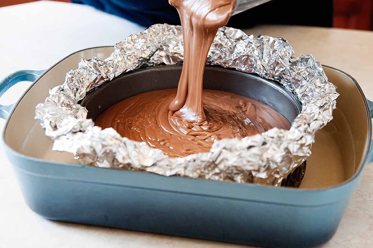 In the case of cheesecake, triple wrap the springform pan in foil, add the cheesecake filling, and set the cake in the center of a roasting pan. If you don’t have a roasting pan, a large, wide-bottomed Dutch oven may also work.