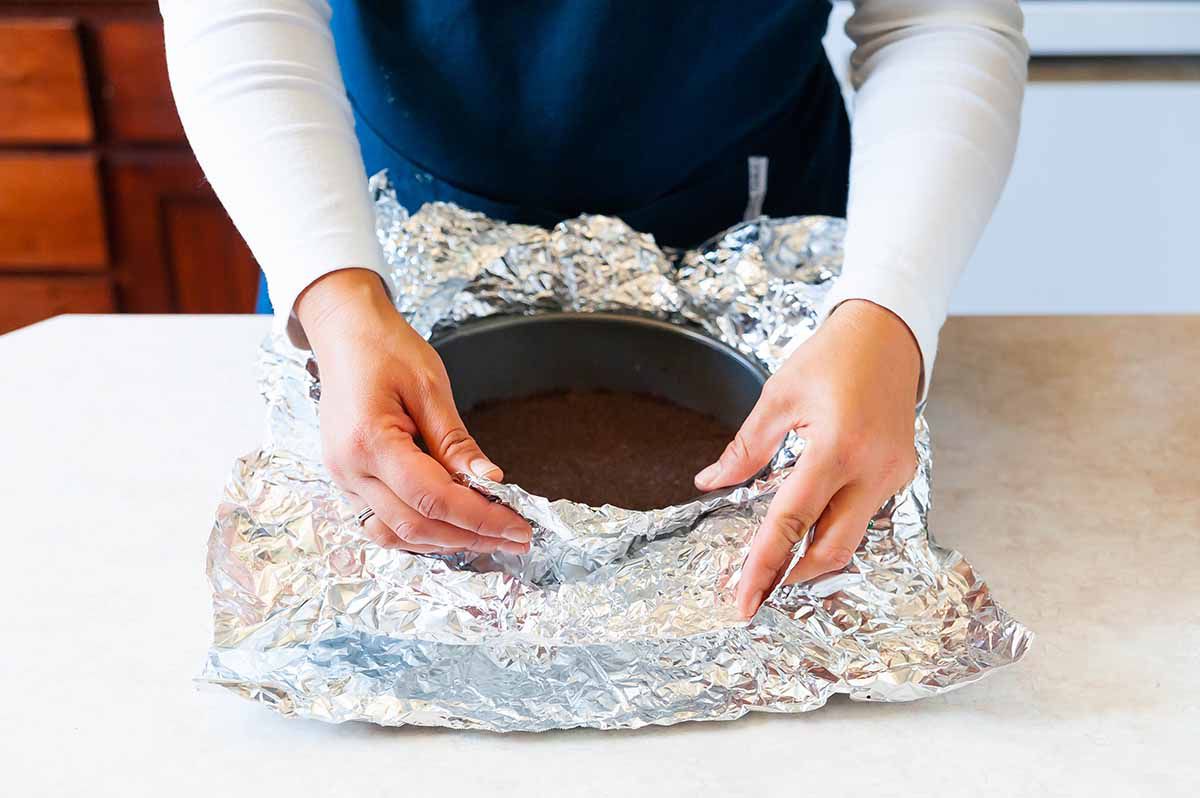 Wrap the outside of the springform pan in 3 layers of wide, heavy-duty aluminum foil. Be careful not to tear or puncture the foil. Bring the foil all the way up the sides. Set it inside a roasting pan or a large Dutch oven.