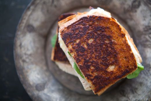 Here's an idea for a quick turkey grilled cheese sandwich. We just happened to have some sweet pickled onions in the fridge, and some arugula growing in the garden, hence the throw-together sandwich.