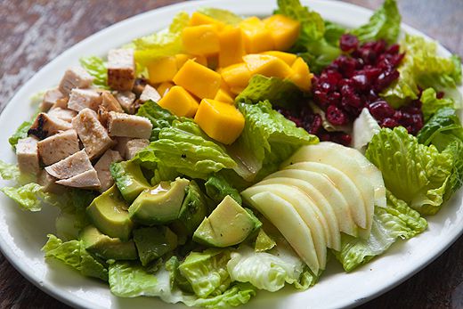 We found a great solution at the Hard Rock Cafe in D.C., in the form of their "Anti-Cobb" salad. Instead of bacon, eggs, and tomato, the Hard Rock salad included mango, apple slices, and dried cranberries. It also has strawberries and supremed orange segments.