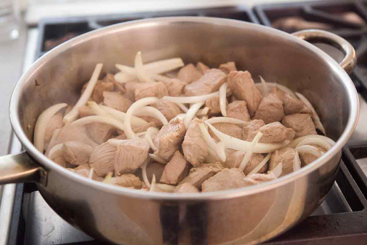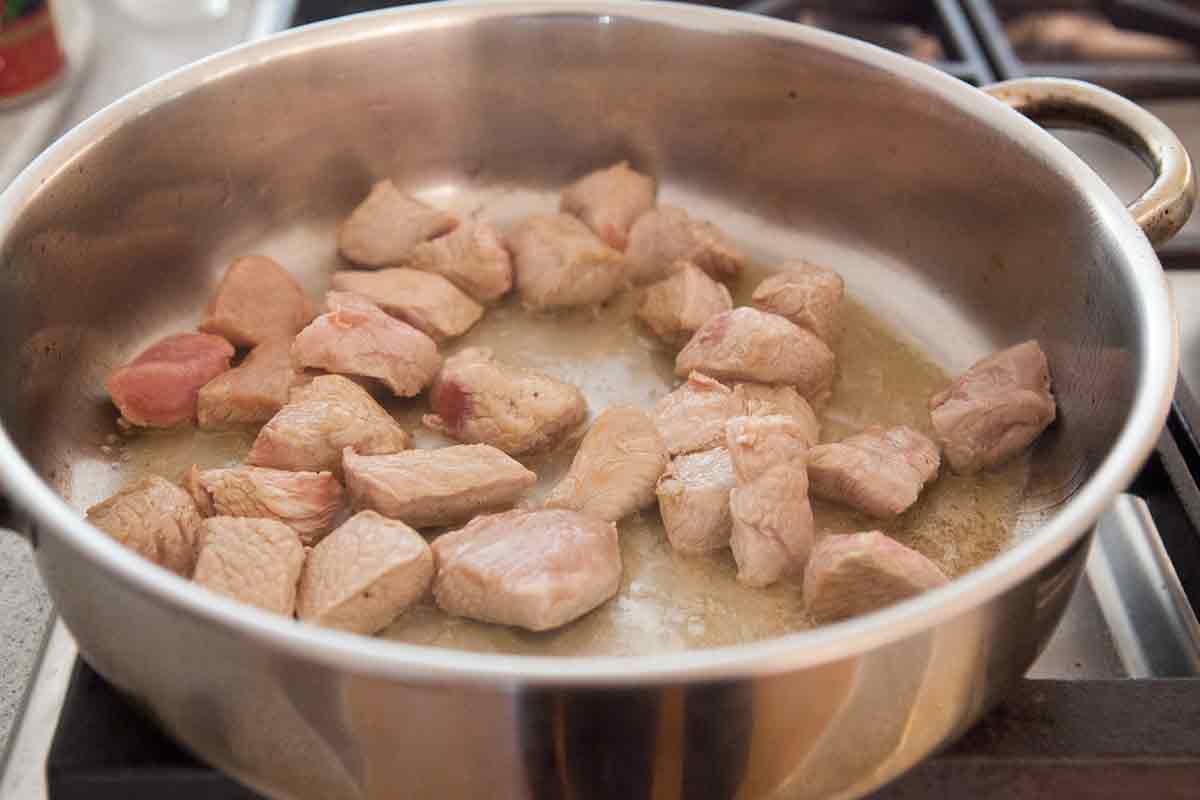 Heat butter or beef fat in a large sauté pan on medium high heat. Pat dry the cubed veal. Sprinkle with salt and add to pan. Working in batches, sauté the meat until the meat is just beginning to brown.