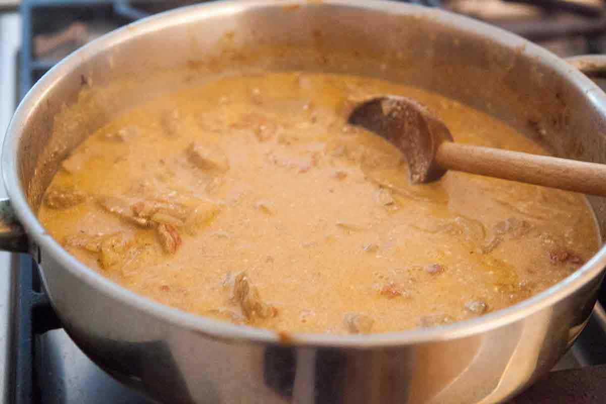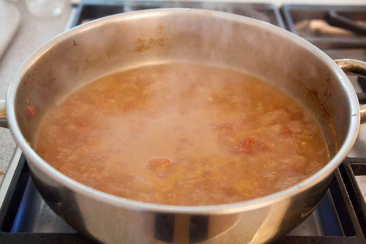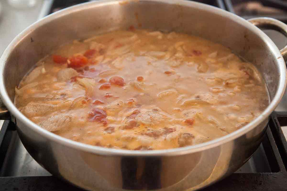 Increase the heat to bring the mixture to a simmer, then lower the heat to maintain a low simmer, uncovered. Cook until the meat is almost cooked through, about 30 minutes.