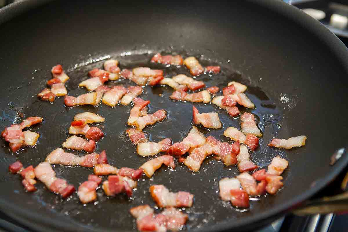 Heat a large skillet on medium heat. Add the bacon and gently cook until lightly browned and most of the fat rendered out, about 10 minutes.