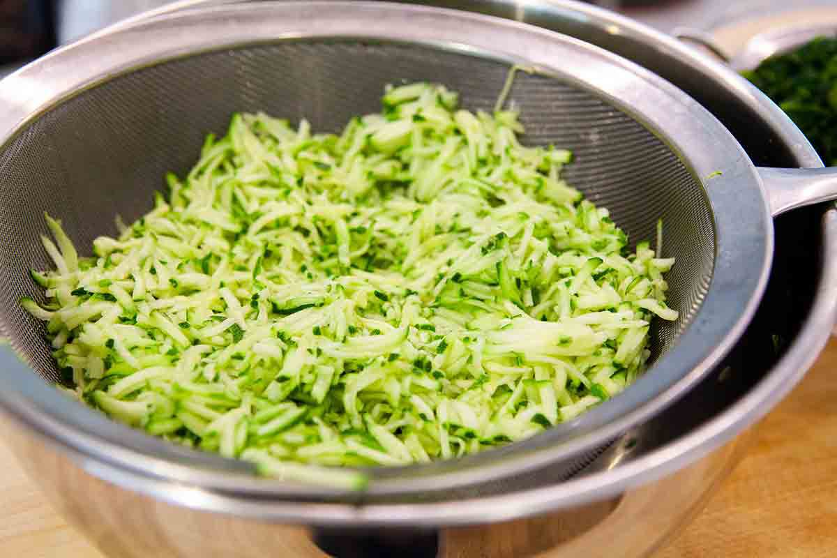 Grate the zucchini. Toss the grated zucchini with about a teaspoon of Kosher salt. Place the grated zucchini in a large sieve (or colander) placed over a bowl to catch the water as the salt helps the zucchini release its moisture.