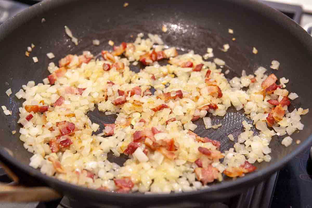 While the bacon is cooking, peel and finely chop the onion. Add the onions to the bacon and cook for an additional 10 minutes, until the onions have softened.
