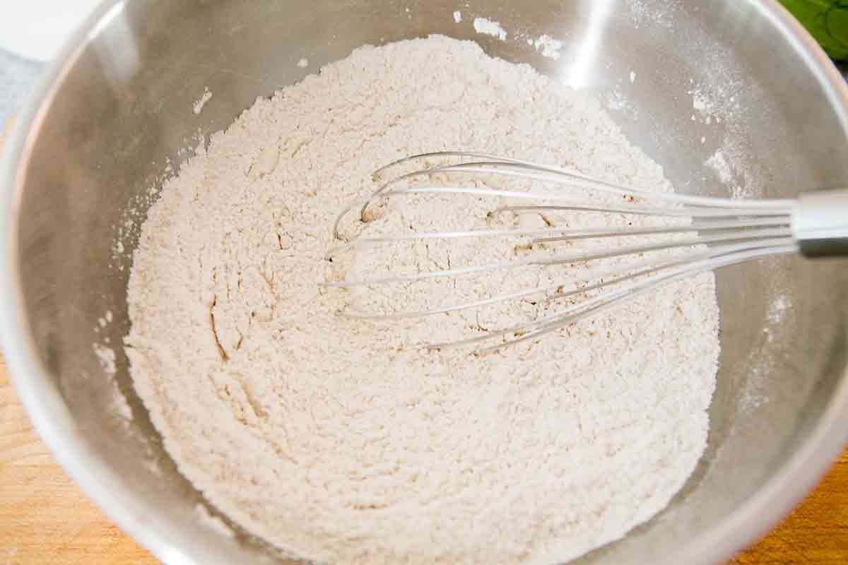 In a medium sized bowl, vigorously whisk together the flour, baking soda, baking powder, salt, cinnamon, and nutmeg.
