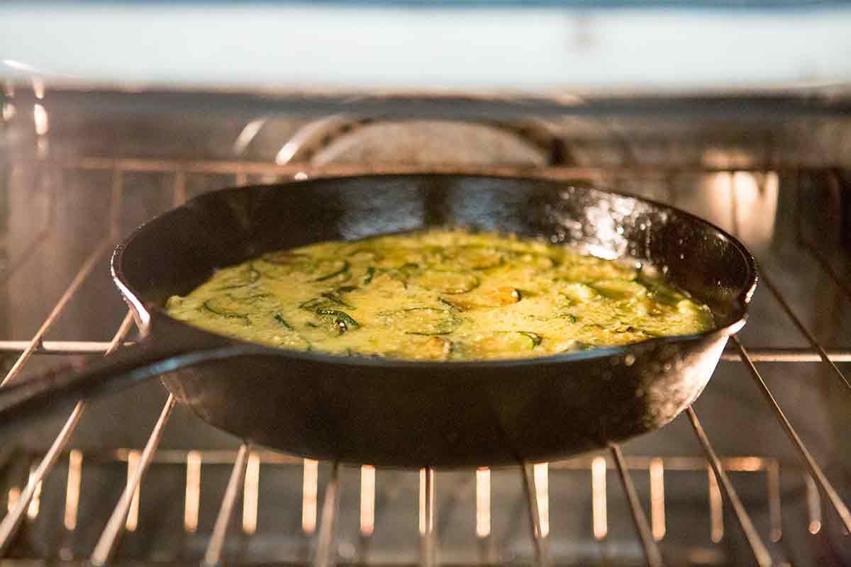 Set the top rack 5 inches from the heating element in the oven. Preheat the oven broiler. Once the top of the frittata has started to set in the pan on the stove top, remove the pan from the stove and place it in the oven.