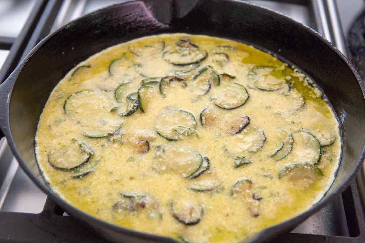 Over medium heat, reheat the skillet until the oil in the pan is hot. There should be a couple of tablespoons of oil left in the pan, if not, add some. When the oil is hot, pour the egg and zucchini mixture into the pan.